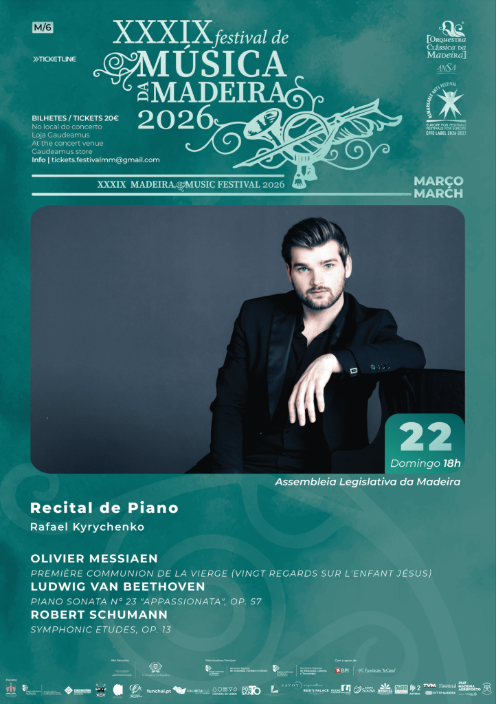 On 22 March at 6 p.m., the XXXIX Madeira Music Festival presents a Piano Recital at the Regional Legislative Assembly with pianist Rafael Kyrychenko, a top-tier performer of the new generation and winner of multiple international awards, recognised for his musical sophistication, interpretative depth and technical precision.