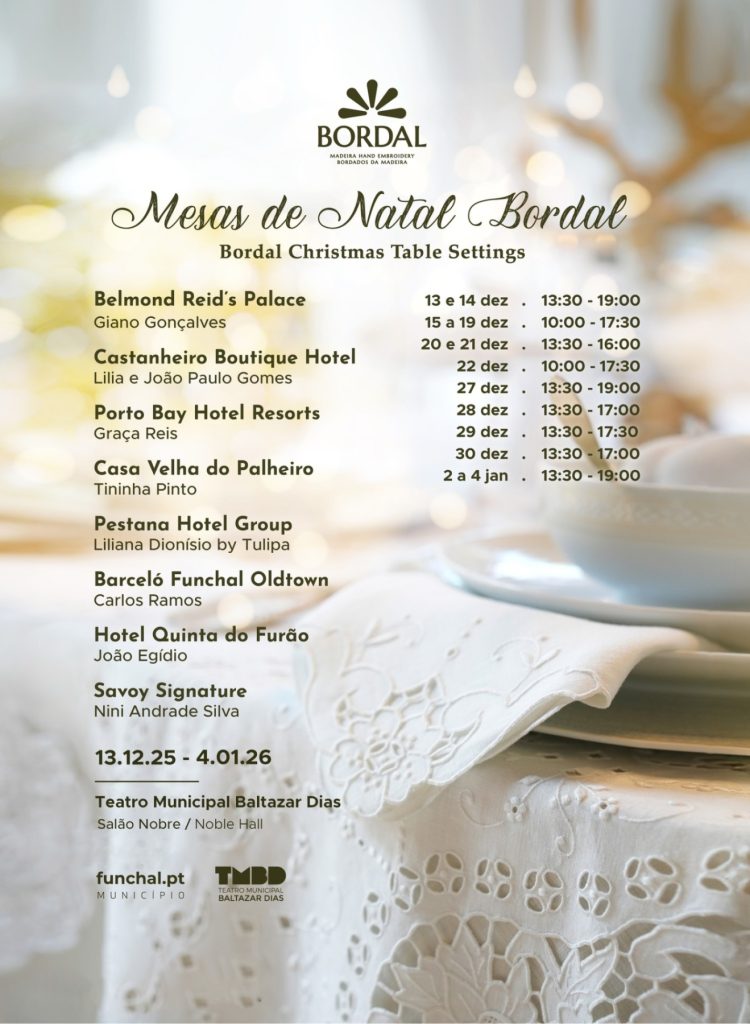 The main hall of the Baltazar Dias Municipal Theater hosts the 10th edition of “Christmas Tables with Madeira Embroidery”. This exhibition inspires both residents and visitors to create the perfect Christmas table, with Madeira embroidery as the centerpiece.