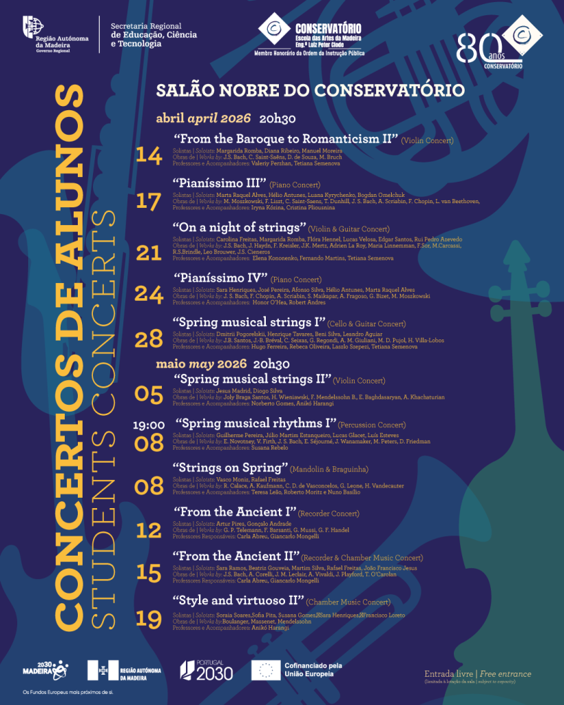 O Conservatório – Escola das Artes da Madeira, Eng.º Luiz Peter Clode, retoma o Ciclo de Concertos para o ano de 2026, que decorrerá ao longo dos meses de abril e maio.